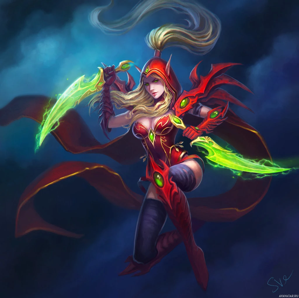 blonde hair with a braid on the side and is dressed in a red and gold outfit with intricate designs. Her pose suggests she is in action or ready for combat. The background is dark with cloud-like elements, adding to the dramatic and adventurous atmosphere of the image. This character appears to be from the Warcraft universe, known for its rich