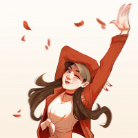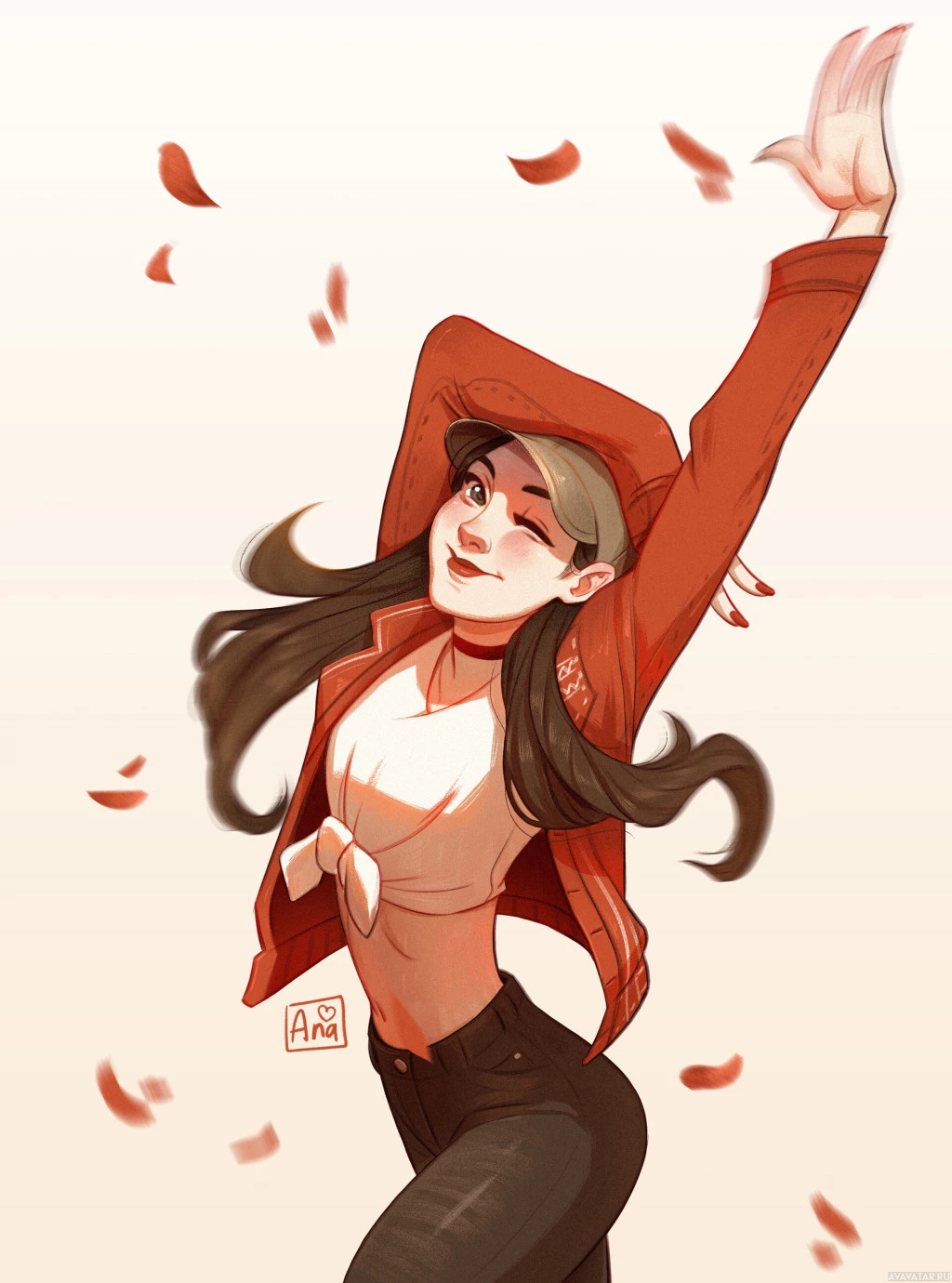 long hair, which falls over her shoulders. There are also some leaves or petals flying around her, suggesting