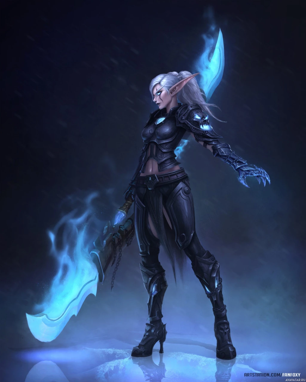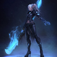 blue crystals at the top and wearing armor that gives off a cyberpunk or tech-like vibe, contrasting with her fantasy appearance. The character has pointed ears characteristic of elves and