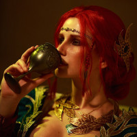 The image features a woman who appears to be cosplaying as Triss Merigold from