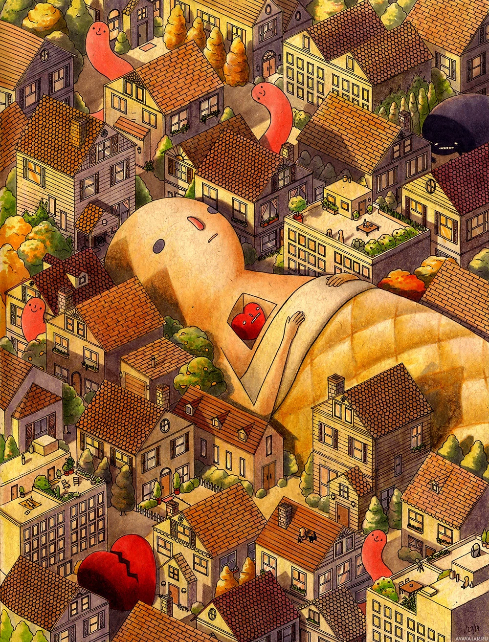 sleeping figure lying on the ground in front of houses and buildings. Above this figure are various items floating in the air, such as hearts, a star, and what appears to be