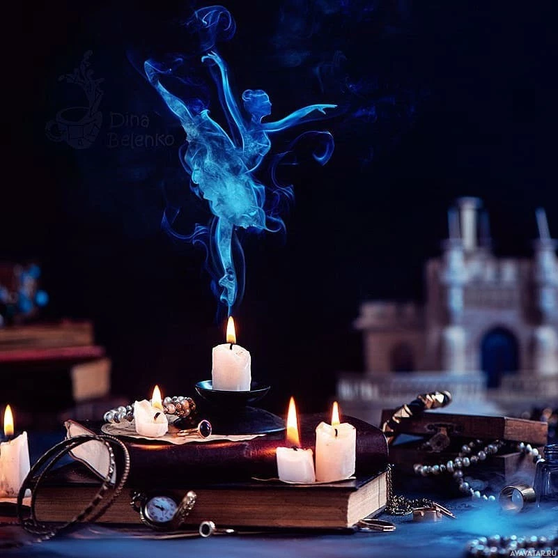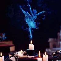lit candles and various other objects like books, jewels, coins, and possibly some kind of divination tools or magical artifacts. The presence of these items suggests that the setup could be related to a ritual, a spell casting, or an act of enchantment. The overall mood of the picture is one of mystery and otherworldliness, with the dancing figure and the smoke creating a sense of motion and magic.