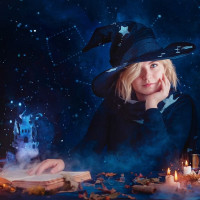 night sky with stars, adding to the magical ambiance of the scene. On the table before her are various items associated with Halloween or witchcraft, including what appears to be a book and possibly some candles or