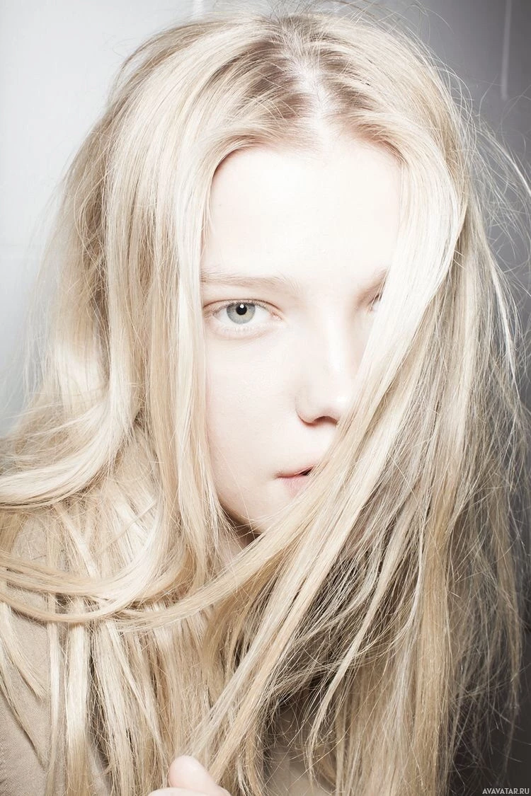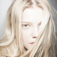 blonde hair, looking downward and slightly to the side. Her expression is thoughtful or contemplative. She appears to be wearing a light-colored top, possibly denim given the visible seam along one of her sleeves. The background is plain, which puts the focus on her. There's an overlay effect that creates a pattern with what looks like pixelated squares or rectangles in various
