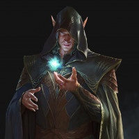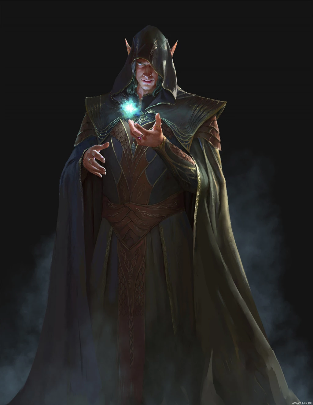 a magical orb or a spell component, enhancing the fantastical element of the character. The background is dark with a mysterious ambiance, which complements the mystical theme often associated with elves in