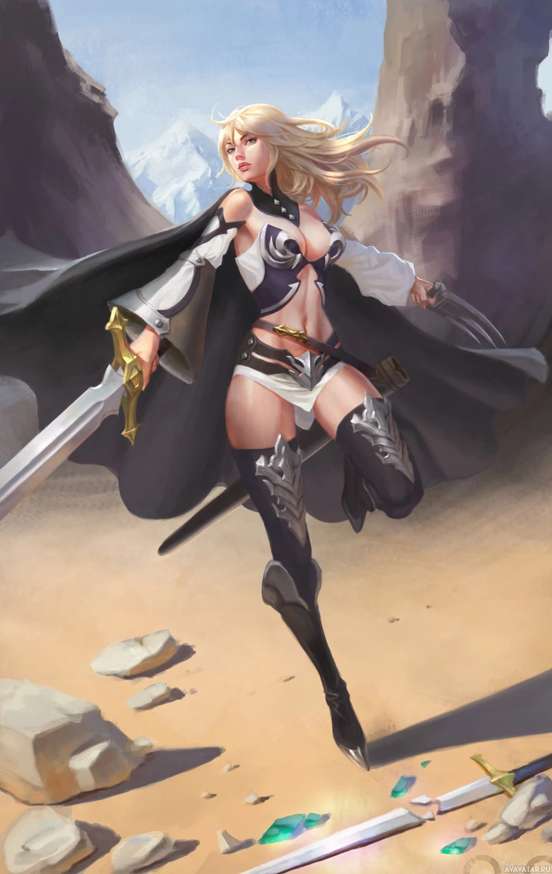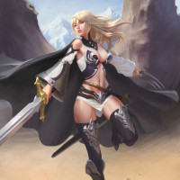 blonde hair and is equipped with a sword, suggesting she might be engaged in combat or preparing for battle. Her attire includes a cloak, which adds to her fantasy-like appearance. There are also gemstones scattered on the ground, indicating that she may have come across treasure during her quest.
