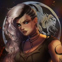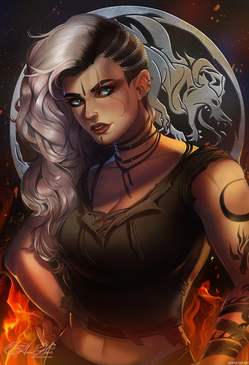 a young woman with silver hair. She has tattoos or markings on her face and arms, suggesting she might be part of an underworld or a fantasy setting where such imagery is common. Her expression is serious, and she's standing in front of what seems to be a flaming backdrop, which could imply that she has