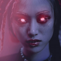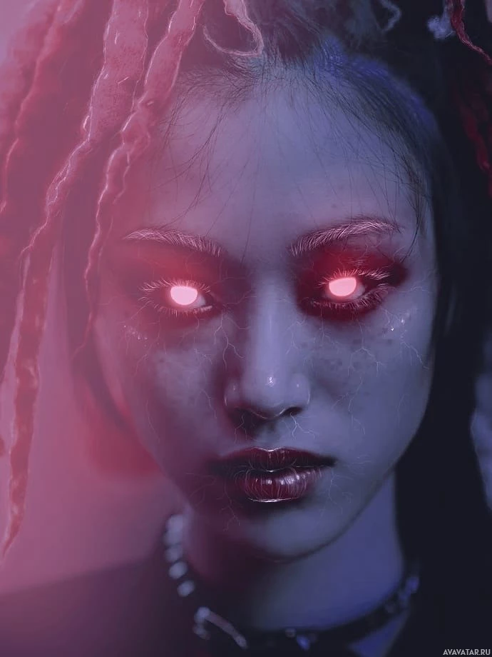 red eyes and dark or blackened skin. They have an intense expression on their face, which is set against a blurred background with