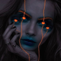 makeup look, which gives them an eerie or otherworldly appearance. Their eyes are painted to resemble glowing
