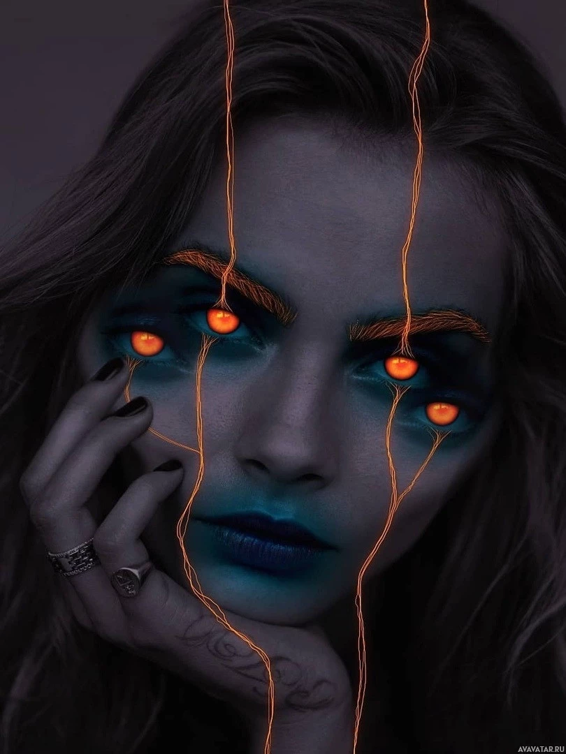 red embers, and the rest of their face is covered in what appears to be blue and black paint, suggesting a fantasy or supernatural theme. The person is holding their hand near their chin, looking directly at the viewer with