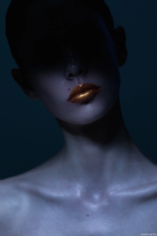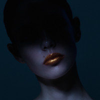 a dark background, with the side of their face illuminated from a source not visible in the picture. The overall style of the image suggests it could be related to fashion or beauty, possibly for advertising or