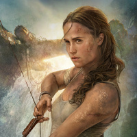 outdoor clothing that suggests an adventurous or survivalist setting. Her expression is intense and focused, indicating she might be preparing to use the bow for hunting or self-defense. The background hints at a natural environment, possibly a wilderness area, which adds to the overall theme of survival or outdoor adventure that is often associated with characters like Lara Croft from