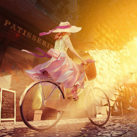 The image features a girl riding a bicycle. She is wearing a hat and has