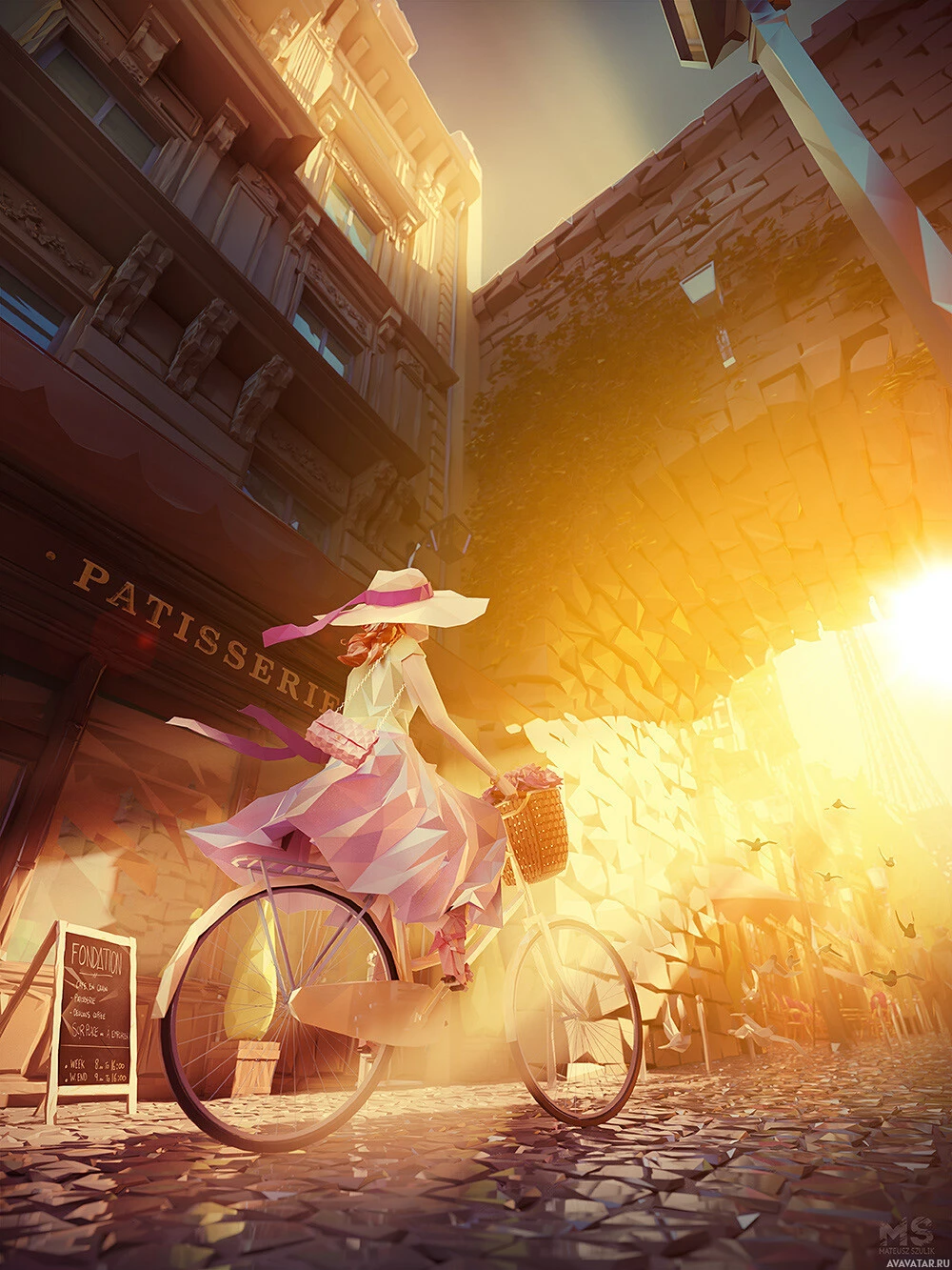 an outdoor cafe to one side with a sign that seems to say "PATISSERIE" (French for pastry shop), suggesting this might be in a French-speaking country or region. The setting is quaint and charming, with the sunlight filtering through the buildings, casting
