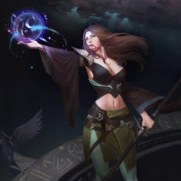 blue energy emanating from her palm. The background suggests a mystical or enchanted environment with