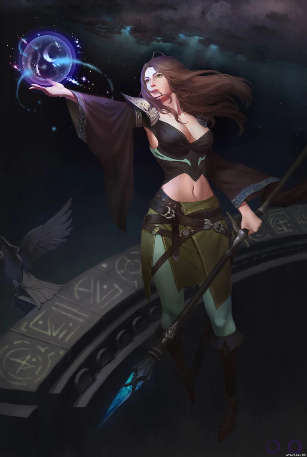 a dark sky, possibly at night, and there are elements such as an owl perched on a ledge to the left of the character. The architecture also has runes or inscriptions that appear to be in a style reminiscent of ancient civilizations' runic writing. The overall style of the image is digital art, likely designed for use in fantasy games, books, or other forms of media.