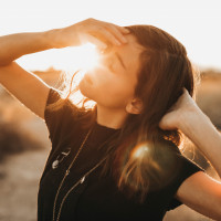 In the image, there is a woman standing with her back to the camera. She appears to be looking up towards the sun with her hands on her head. The setting seems to be an open landscape during sunset or sunrise, given