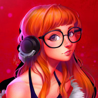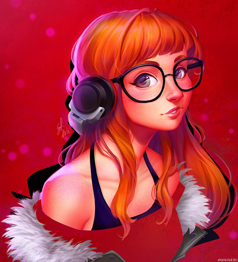 red hair wearing glasses. She is also wearing headphones and has a microphone attached to them. Her attire includes what appears to be a fur-