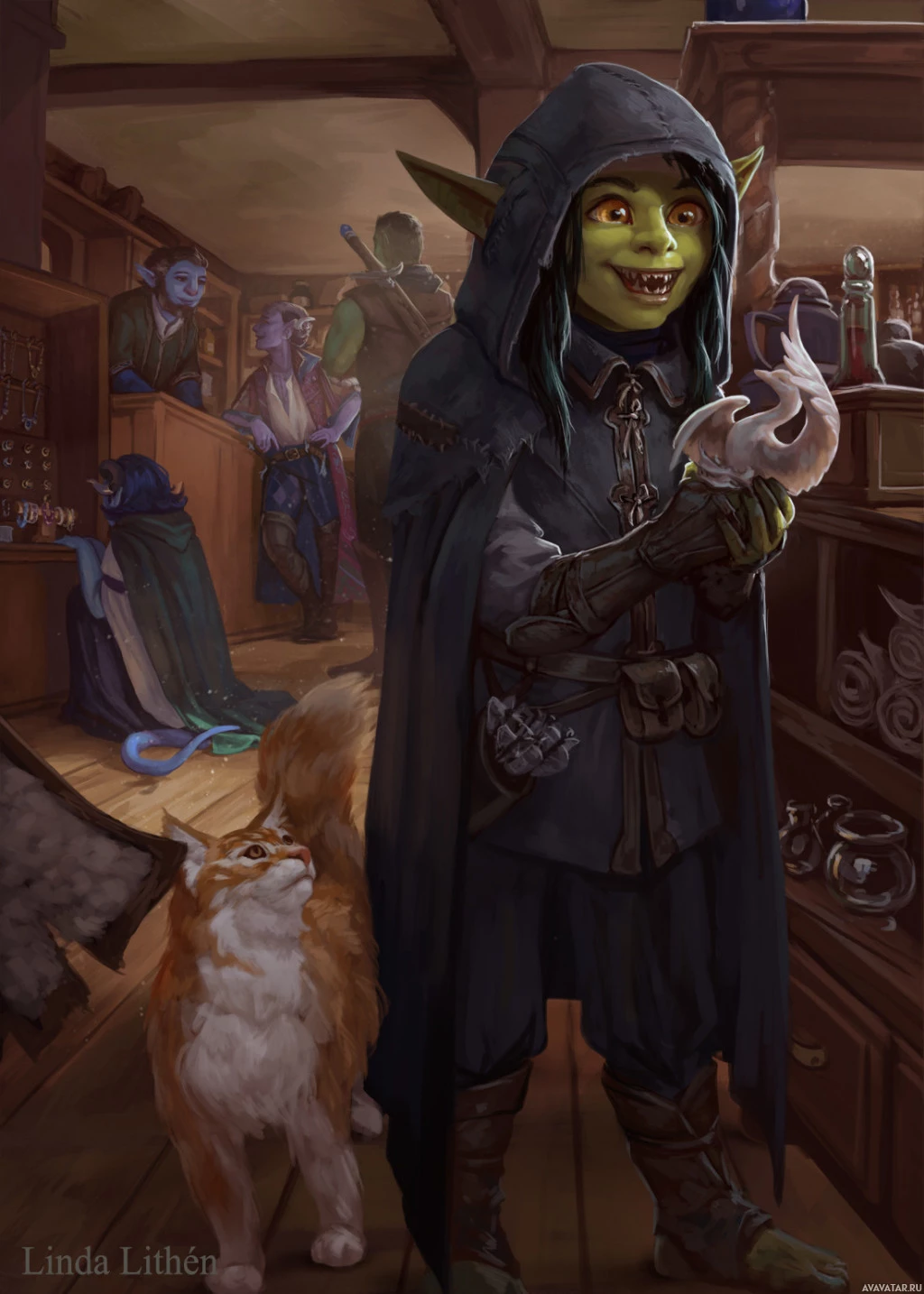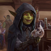 a fantasy character who appears to be an elf or gnome with pointed ears and a mischievous grin. The character is wearing a black