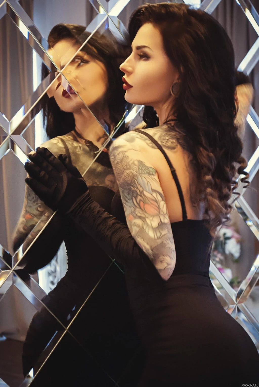 The image features a woman posing in front of a mirror. She appears to be a brunette, and she has various tattoos on her visible