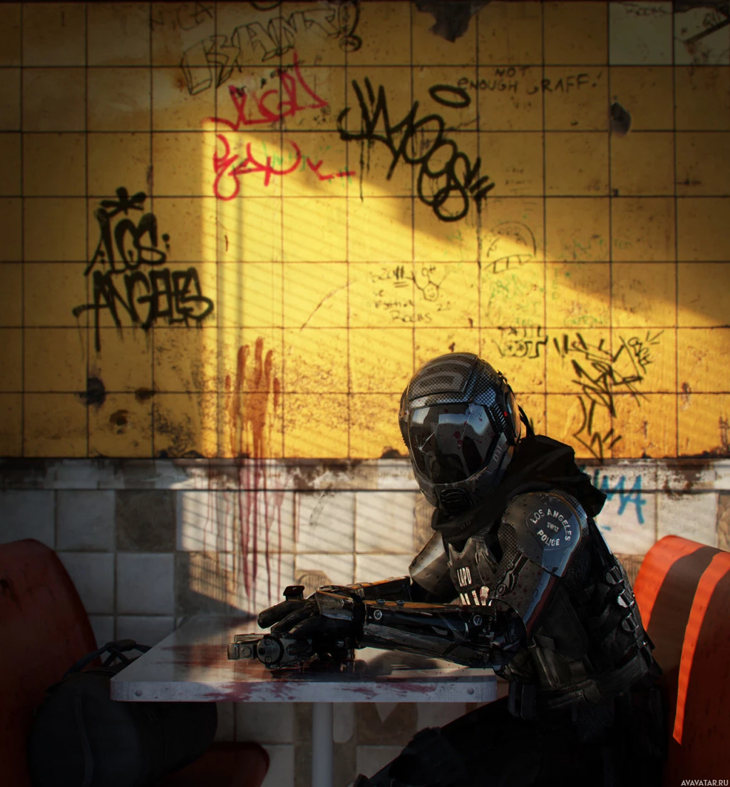 science fiction themes. The character is seated at
