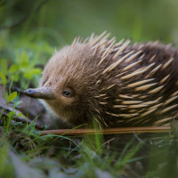 На картинке изображен младенец вомбат, также известный как джой. Он стоит на задних лапах и с интересом смотрит на что-то на земле. Фон предполагает естественную среду обитания, возможно, травянистую область или лесной пол.