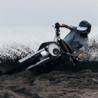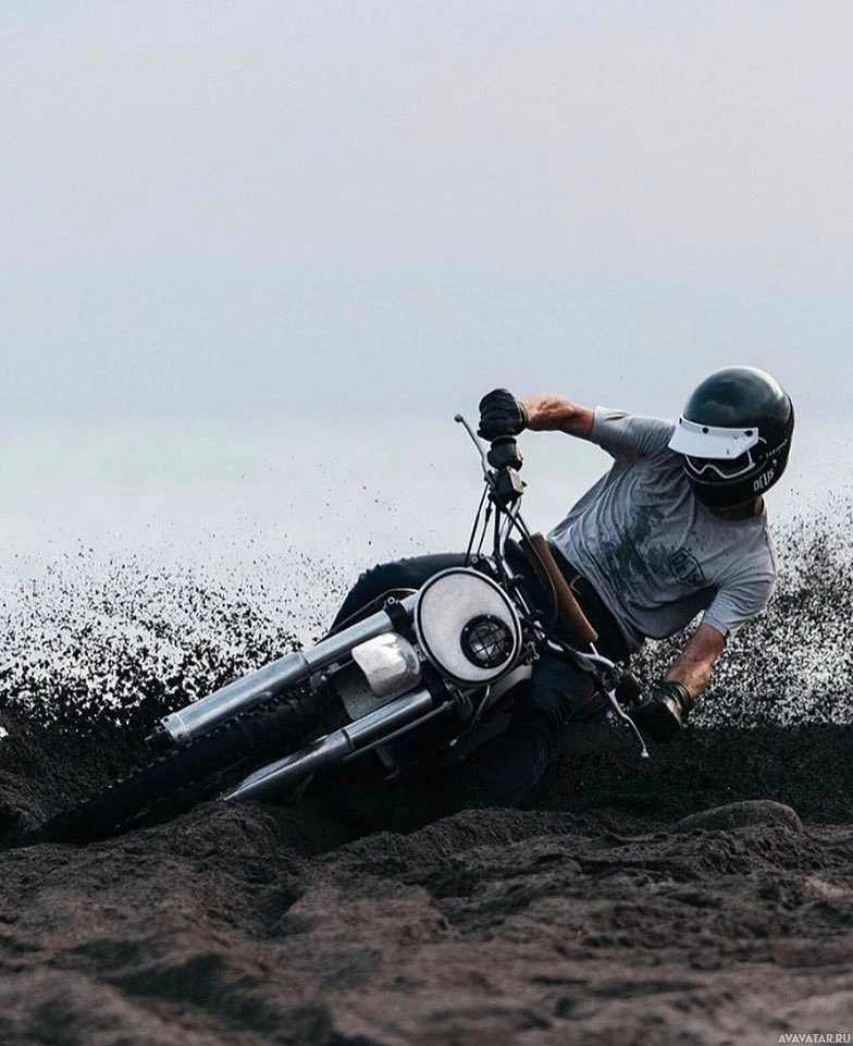 sandy terrain. He is leaning into a turn, which has caused the sand behind him to spray upwards due to his speed and movement. This suggests that he may be on a beach or in a desert-like environment, as such loose soil would not typically occur in more conventional settings for