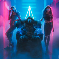 neon lights, giving off a futuristic or cyberpunk atmosphere. The characters are styled in