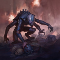 a chaotic environment, possibly after some sort of battle, as indicated by the destruction around it. There are smoking ruins, and the ground appears to be littered with debris and the remains of what might have been living creatures or machinery. The colors are predominantly dark and moody, enhancing the sense of