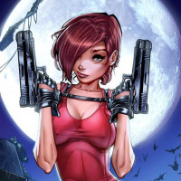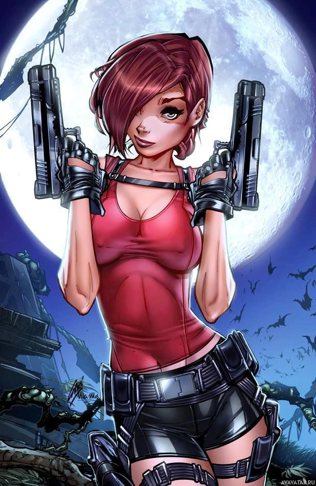 red hair and is wearing a black tank top with shorts. Behind her is the silhouette of the moon against the backdrop of a dark