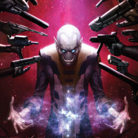 a science fiction setting, seemingly being shot at by multiple weapons. The character is in the center of the frame, looking directly ahead with his arms outstretched. There are various firearms pointed towards him from