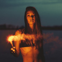 The image shows a young woman standing on a beach at night. She is wearing a black bikini and has her hands raised, with what appears to be a sparkler or lighted stick in one hand, emitting a glowing effect that stands out against the dark background of the sky. The water near her reflects the faint light from the sparkler. It's a picturesque moment capturing the serene and mysterious atmosphere of nighttime by the sea.