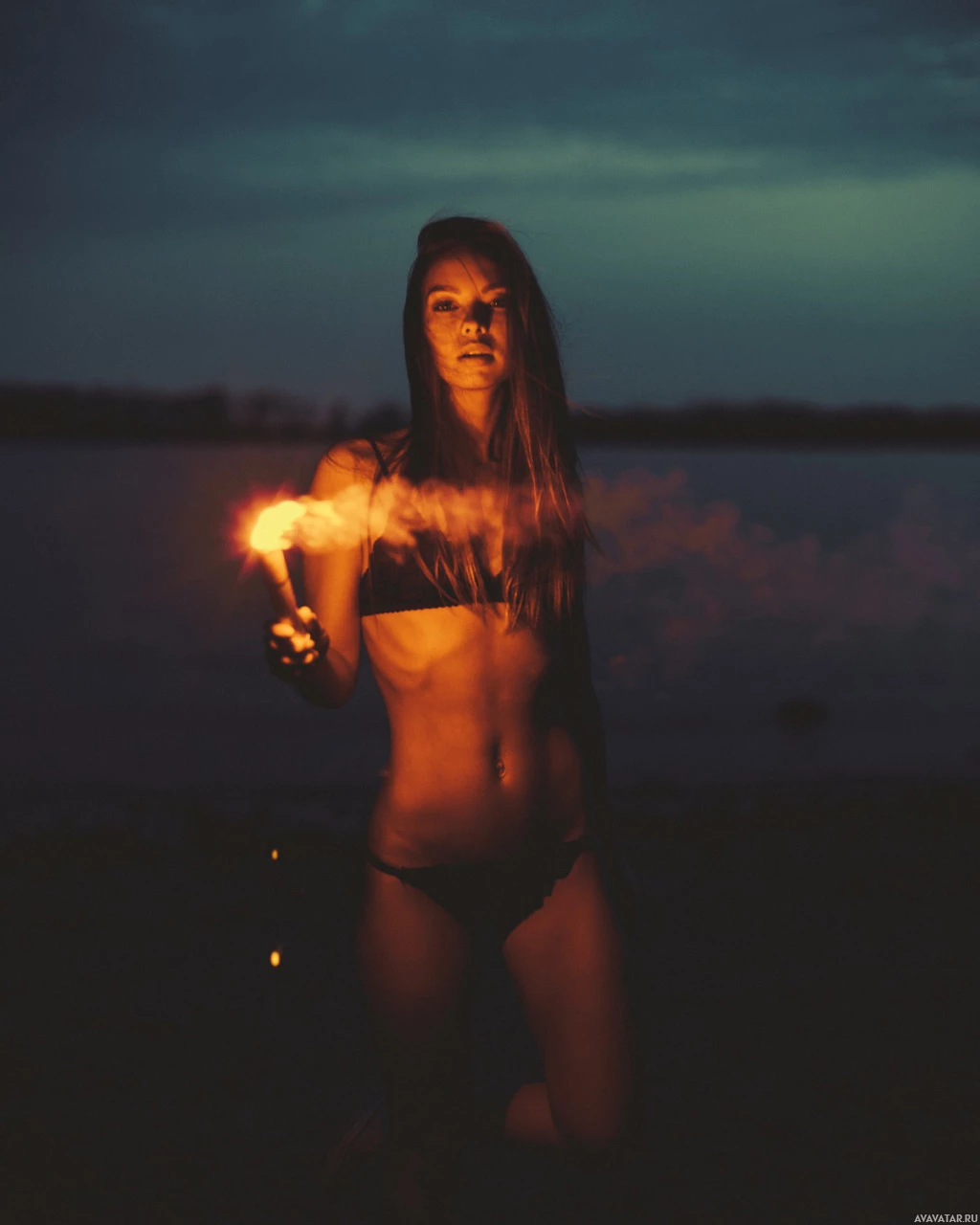На снимке изображена молодая женщина, стоящая на пляже ночью. Она носит черное бикини и поднимает руки, в одной руке появляется сверкающая или освещенная палка, излучающая светящийся эффект, который выделяется на темном фоне неба. Вода рядом с ней отражает слабый свет от искры. Это живописный момент, захватывающий безмятежную и таинственную атмосферу ночи у моря.