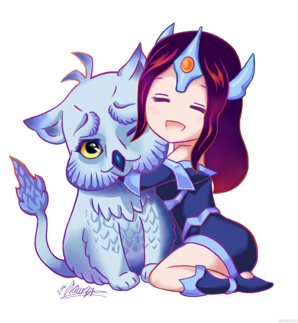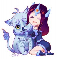 an animated character who appears to be Mirana from the game Dota 2. She is interacting with a creature that resembles a cat, which has features similar to an owl's face. The character is wearing her signature armor and has