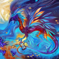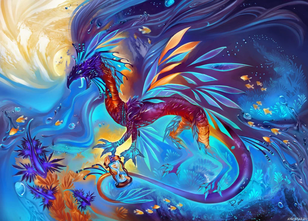 a fantastical dragon-like creature swimming through an underwater realm. The dragon has large, wing-like fins that extend from its body, suggesting it might be able to fly or dive with ease. Its scales and skin are adorned with