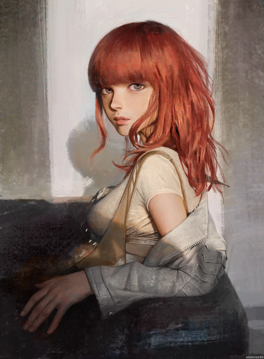The image shows a painting of a young woman with red hair. She is dressed in what appears to be a vintage-style top and has a contemplative expression on her face. The style of the artwork suggests it may be inspired by classical or impressionist techniques, giving it a timeless and somewhat ethereal quality.