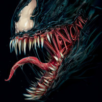 The image shows Venom, a fictional character from the Marvel Comics universe. He is depicted with a highly detailed and realistic appearance, highlighting his distinctive white spider-like markings on his body and the iconic black costume with a large, muscular build.