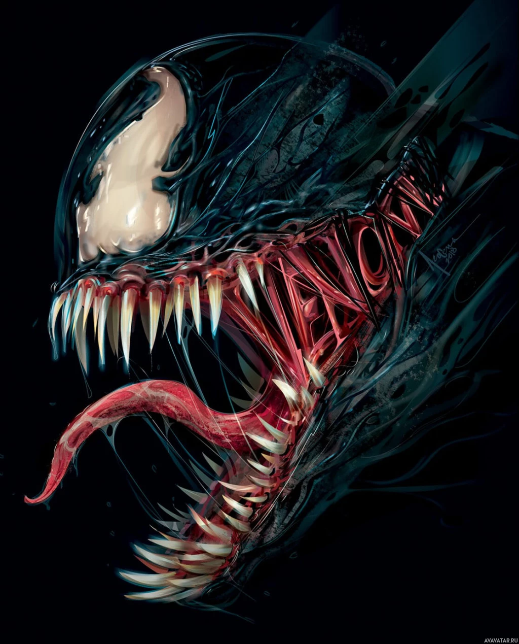 Картинка показывает Венома, вымышленного персонажа из вселенной Marvel Comics. Он изображен с очень детализированной и реалистичной внешностью, подчеркивая его отличительные белые паукообразные отметины на теле и культовый черный костюм с большой, мускулистой конструкцией.