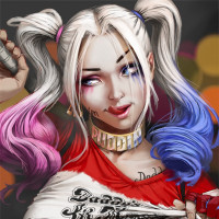 red suit, pigtails, face paint, and other elements that are characteristic of her look in various media representations. The artwork has a dynamic quality, suggesting motion or energy.
