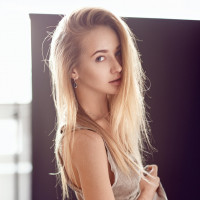blonde hair. She is posing in front of what appears to be a photography backdrop or