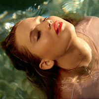 back in water. She appears to be relaxed and possibly asleep, with her eyes closed and her head resting on the poolside or floor of the pool. The environment suggests