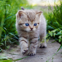 На снимке изображен маленький котенок с характерными голубыми глазами. Кажется, что он изучает окружающую среду, возможно, на открытом воздухе, например, в саду или в поле, где он идет по чему-то похожему на дорожку из травы и почвы.