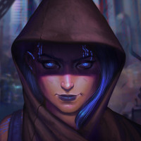 a female character with blue hair and glowing eyes, wearing a hood that obscures the upper part of her face. She has