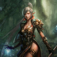 white hair with blue accents, which might suggest she is some sort of magical or royal being within the fantasy context. The character is wearing armor and carrying what appears to be a bow and quiver, suggesting that she could be a ranger or archer in this setting. Her attire includes intricate details and patterns, adding to her mystical and otherworldly appearance. The background features a lush,