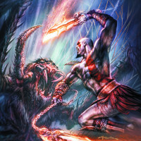 video game series. The character is wielding a spear and fighting against creatures that resemble snakes or serpents. There are also magical elements, such as what appears to be a spell or an energy being used by the character. The setting seems to be in a fantastical environment with