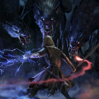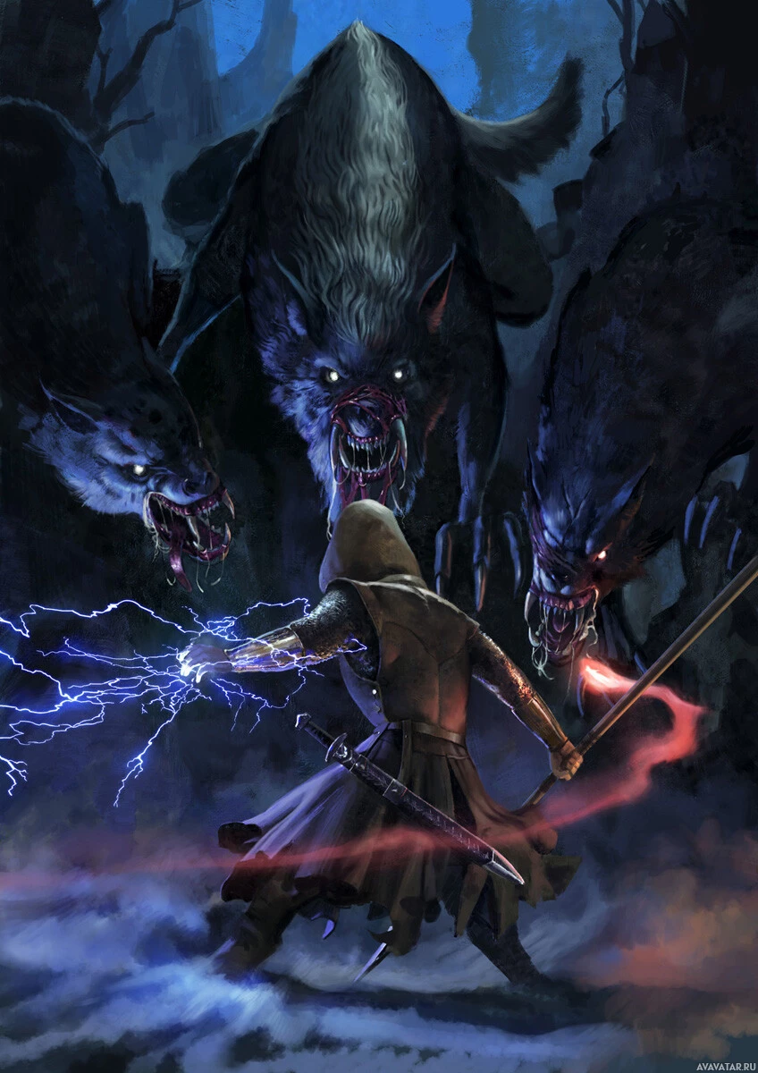 a fantasy scene with a figure standing in the foreground, who appears to be an adventurer or hooded character wielding a staff that is emitting lightning. In the background, there are three werewolves, each showing