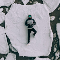 icy environment, possibly after a harsh winter or during an event where ice has formed rapidly. The person is wearing warm clothing and seems to be enjoying