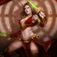 fantasy character who appears to be an elf from the game "World of Warcraft." She is wearing a detailed armor with red and gold colors, which gives her a regal or warrior-like appearance. In her hands, she holds two