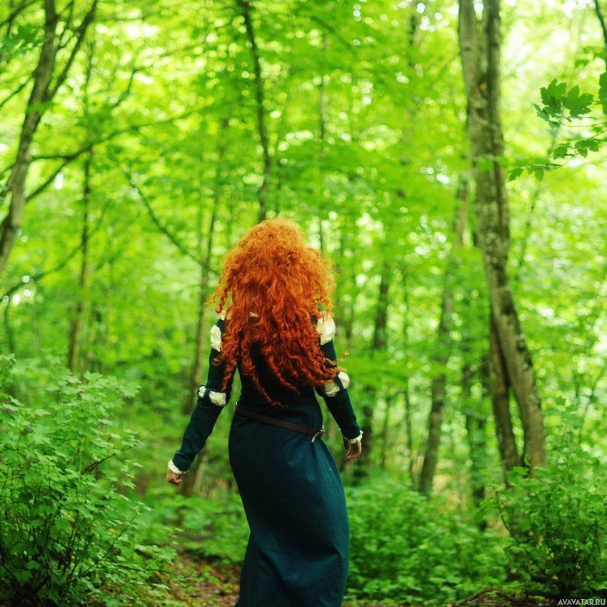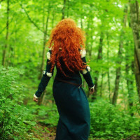 red hair and is wearing a dress that fits the style of Merida's clothing in the film. This scene captures the essence of