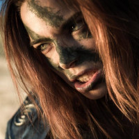 a combat situation or performing a survival task. Her expression is intense, possibly indicating that she is ready for battle or navigating